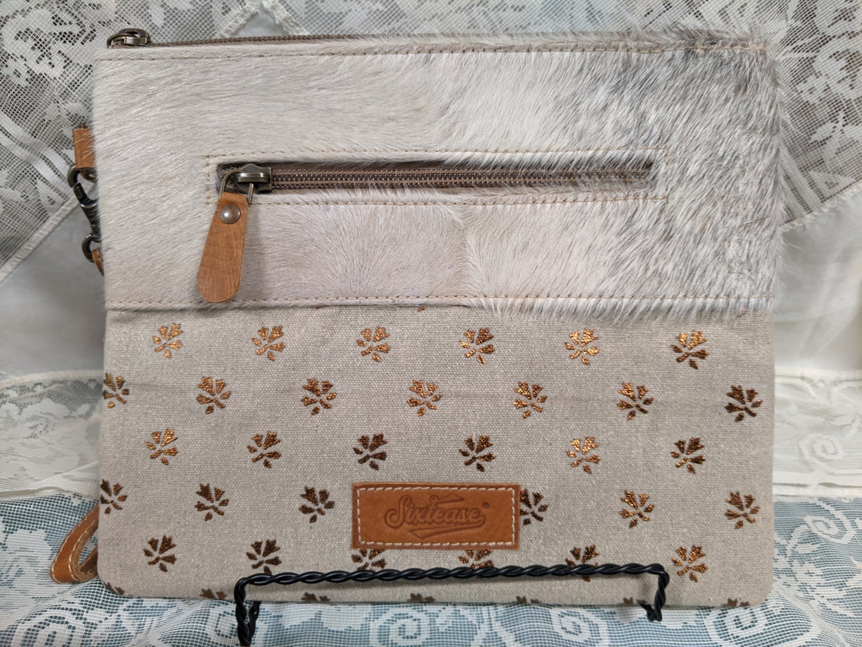 Beautifully designed pouch with light-reflective flowers. The colors and perfectly accented with fur! Fully lined, with no inside pockets. Fully zippered top closure with front zippered pocket. Stitched to perfection with a fur accented pocket and debossed Sixtease leather logo.