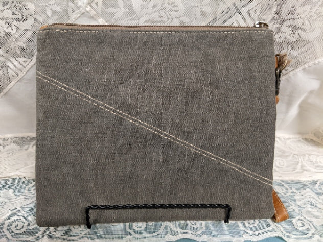 Material: Canvas, Leather accents, and Fur. Measures: 8" x 9.5". 6" handle YKK Brass Zippers