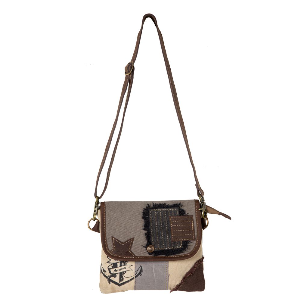 The Vintage Adventurer Crossbody Bag offers a unique combination of durability and style. It features a canvas and leather patchwork design with an anchor overprint. Inside, you'll find a zipper-close top with a back of matching woven canvas. The adjustable and removable shoulder strap is made of durable leather. Perfect for a stylish and practical look.