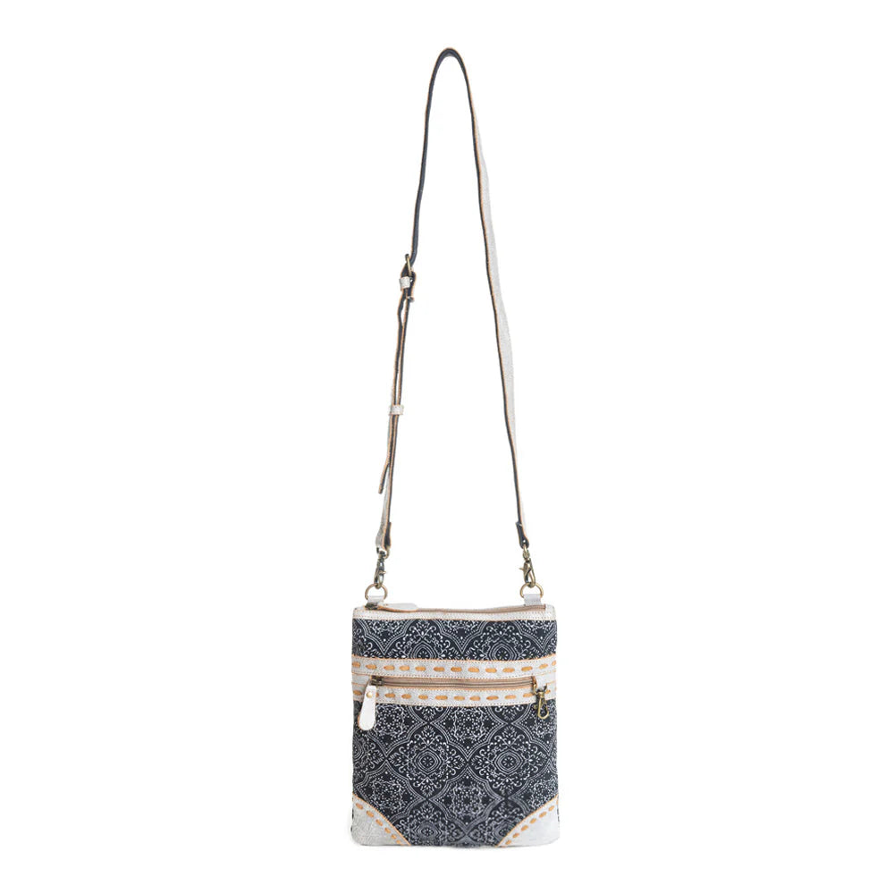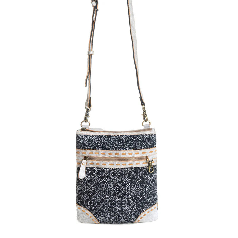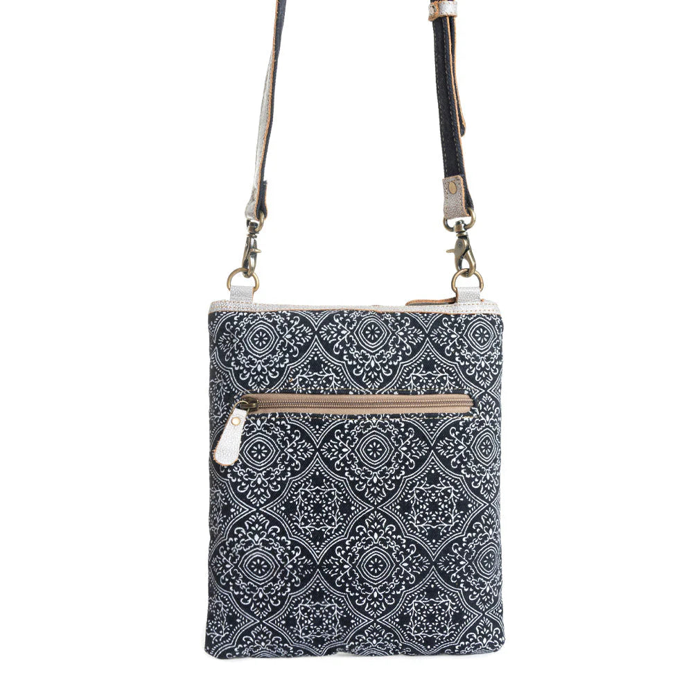 Embrace sustainable fashion with the Moroccan Nights Crossbody Bag, crafted from upcycled canvas featuring a refined dark navy blue and white geometric pattern. Detailed with rich leather trim and an adjustable leather strap, this bag combines durability with versatility. Its compact shape includes multiple zippered pockets—front, back, and inside—offering secure and organized storage. The full zipper closure ensures your essentials stay protected, making it an ideal accessory for the eco-conscious woman balancing style and practicality every day.