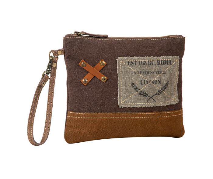 The When in Roma pouch is perfect for those who seek to express their love for international travel. Combining canvas patchwork designs with leather and metal accents, this durable creation is completed with charming French and Italian influences. It features a zippered top closure and a dual-color matching woven canvas back.